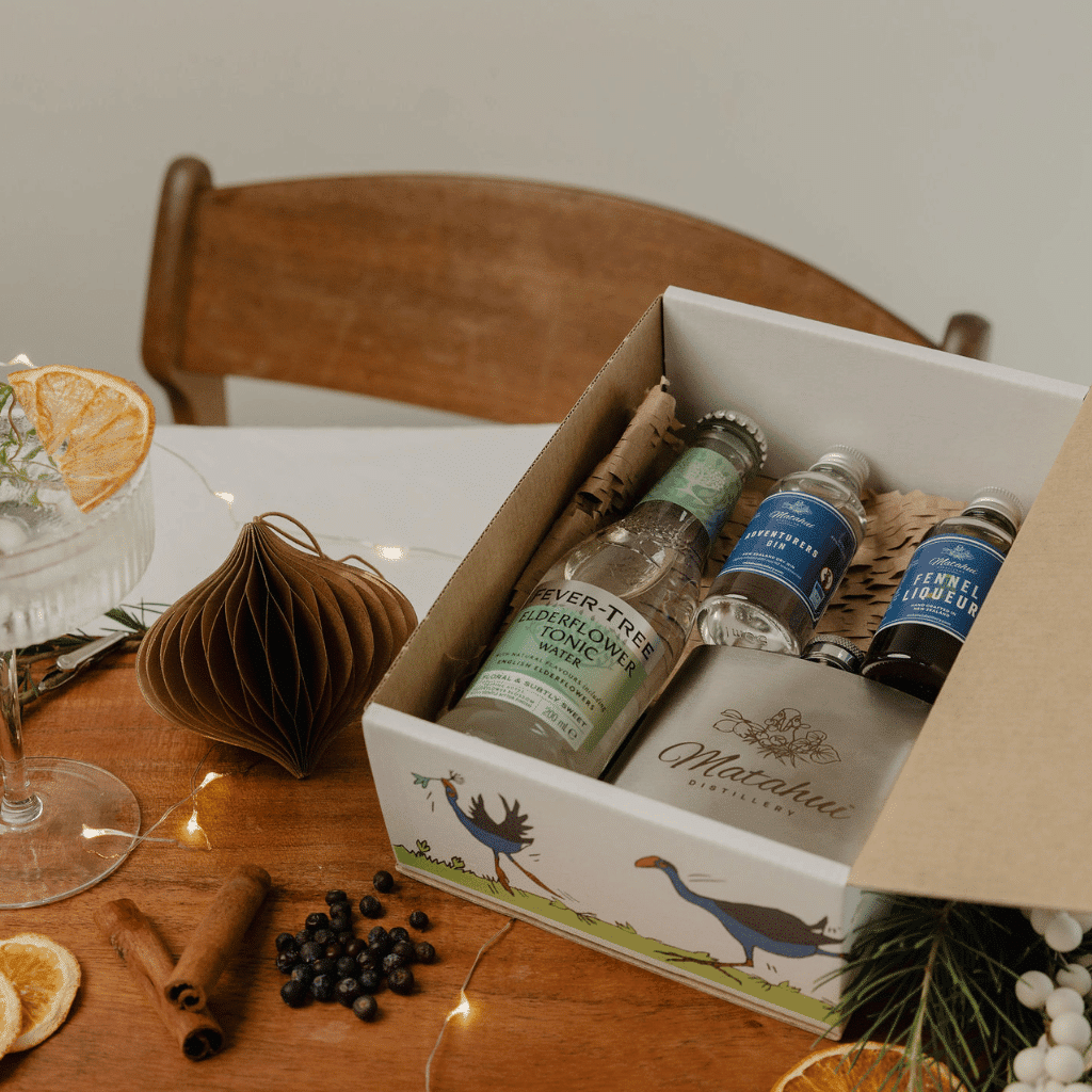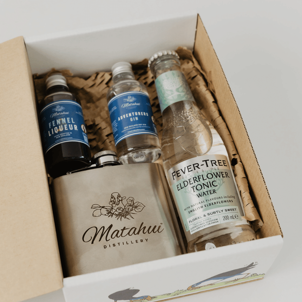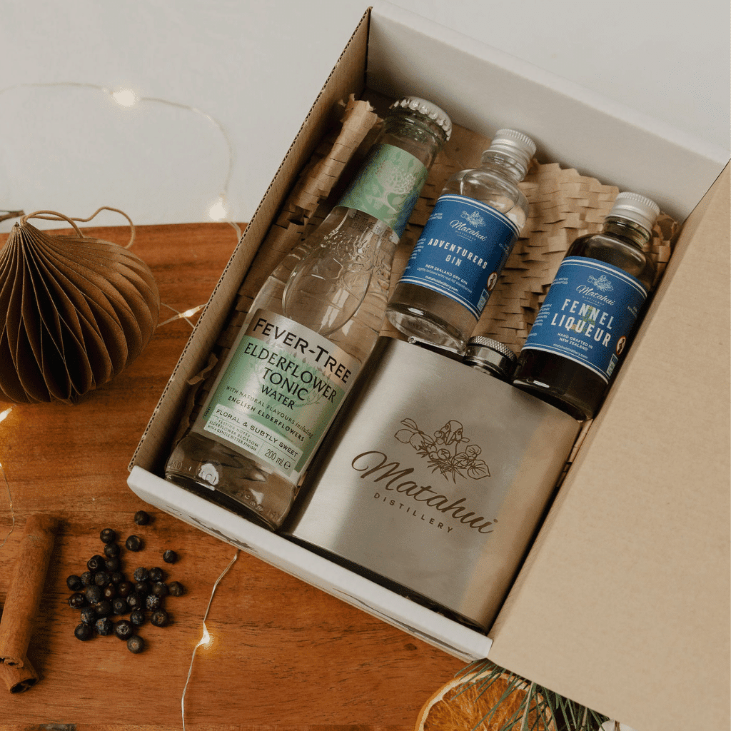 Treat your favourite gin lover to the Adventurers Gift Box featuring a Matahui-branded hip flask, award-winning gins, and a premium mixer.